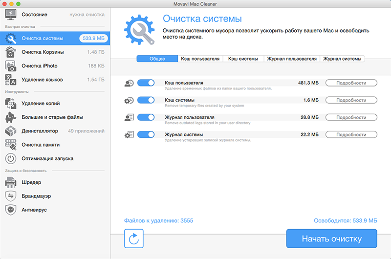 Когда вы запустите Movavi Mac Cleaner, программа сразу же проверит ваш компьютер на наличие мусора. Вам ничего не нужно делать самостоятельно – Movavi Mac Cleaner автоматически просканирует каждый уголок вашей системы и покажет результат. - Избавьтесь от всех ненужных файлов одним нажатием